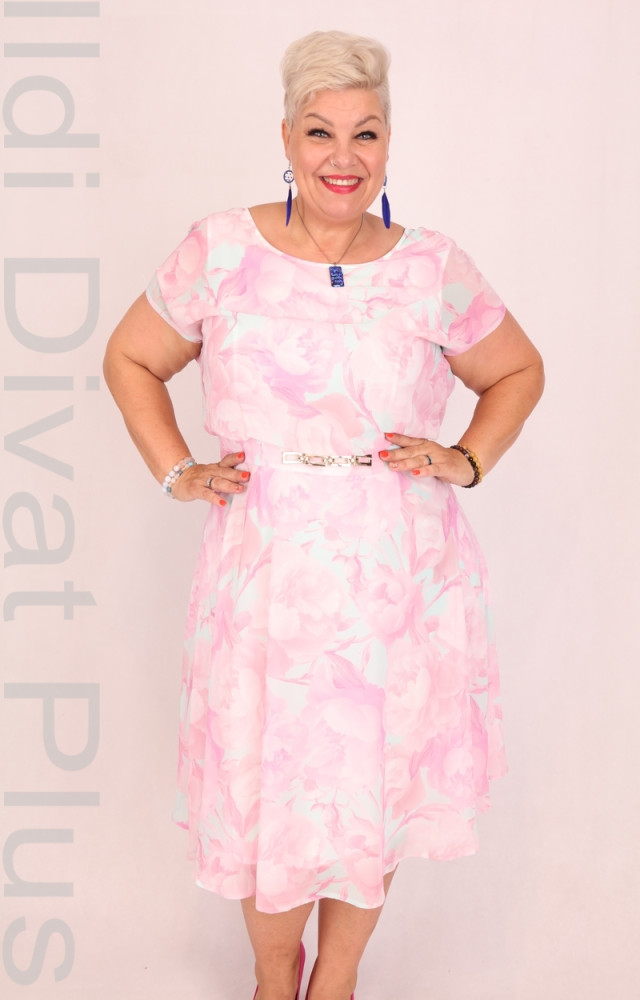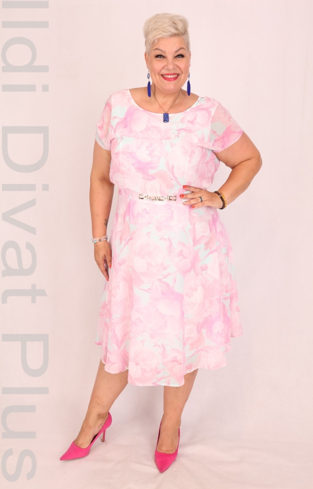 Trynite mentazöld alapon rózsaszín virágmintás, kerek nyakú, muszlin anyagú, derekán díszcsatos, felső részén lezser fazonú, A-vonalú ruha.