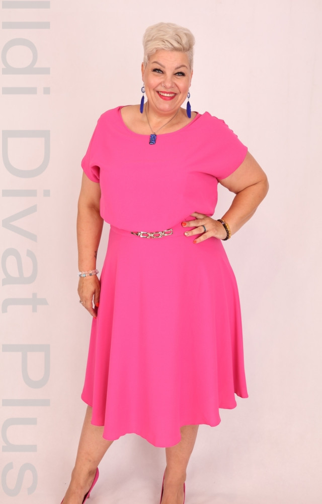 Trynite pink színű, kerek nyakú, muszlin anyagú, derekán díszcsatos, felső részén lezser fazonú, A-vonalú ruha.