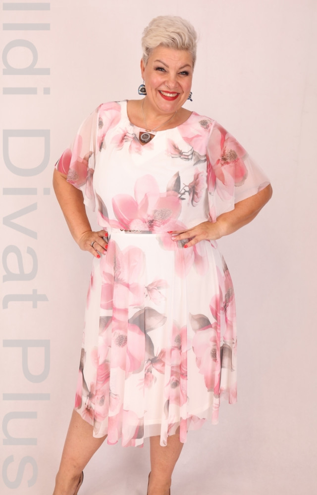 Trynite ekrü-púder virágmintás, kerek nyakú, muszlin anyagú, derekán díszcsatos, felső részén lezser fazonú, A-vonalú ruha.