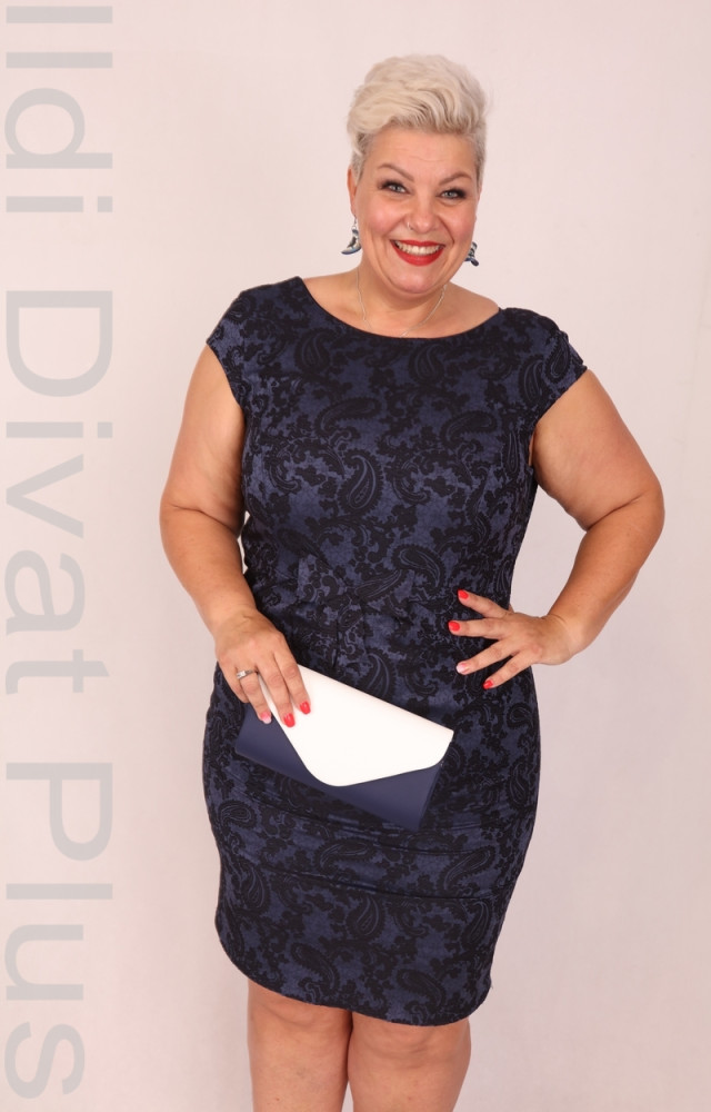 Botega Elena sötétkék színű, kerek nyakú, anyagában mintás, karcsúsított fazonú ruha.