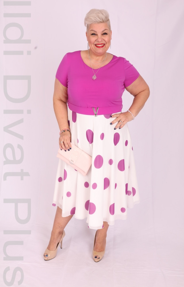 Elli lila-fehér pöttyös, kerek nyakú, derekán díszcsatos, A-vonalú alkalmi ruha.