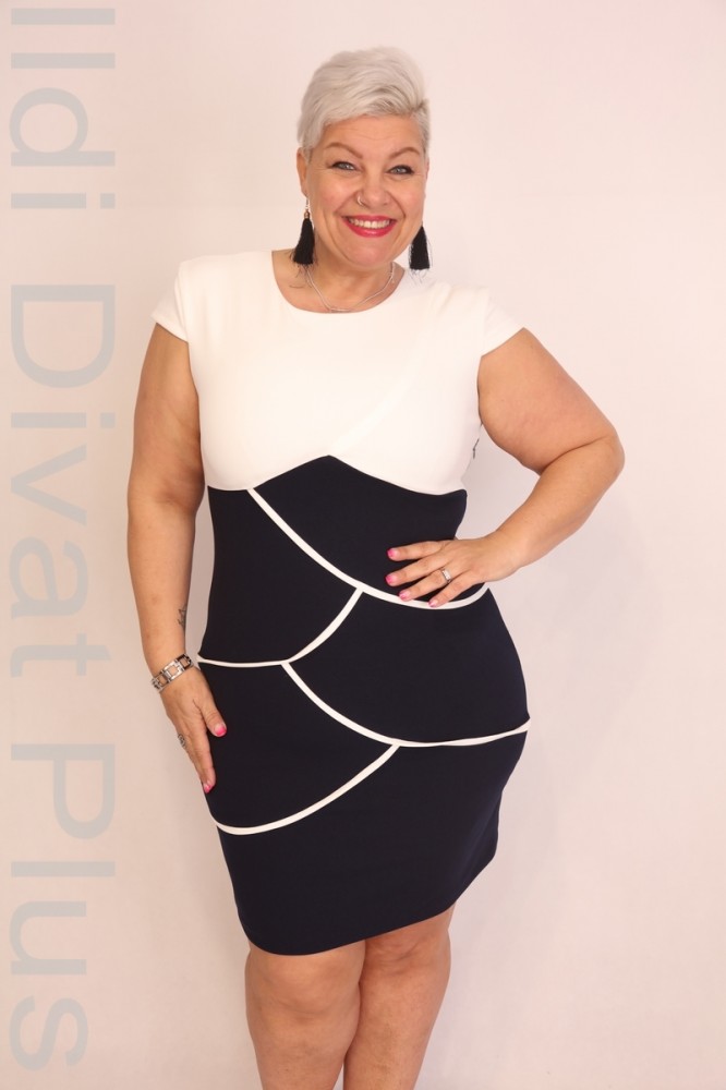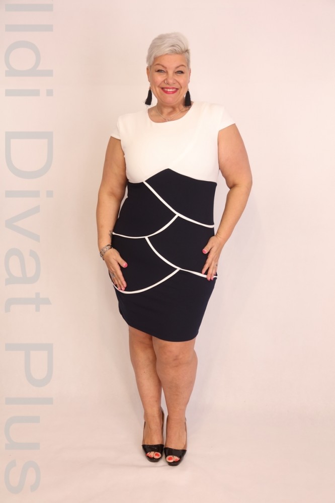 Phardo sötétkék-fehér színű, kerek nyakú, karcsúsított fazonú ruha.