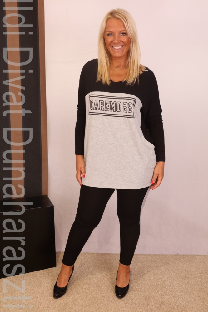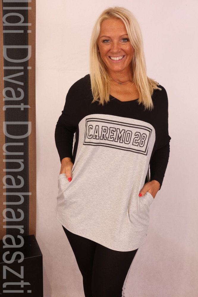 Caremo szürke-fekete színű, V-nyakú, kapucnis, elején filmnyomott, lezser fazonú tunika