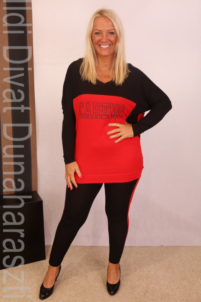 Caremo piros-fekete színű, V-nyakú, kapucnis, hosszú ujjú, elején filmnyomott, lezser fazonú tunika