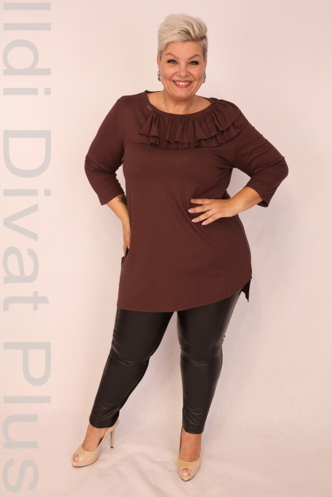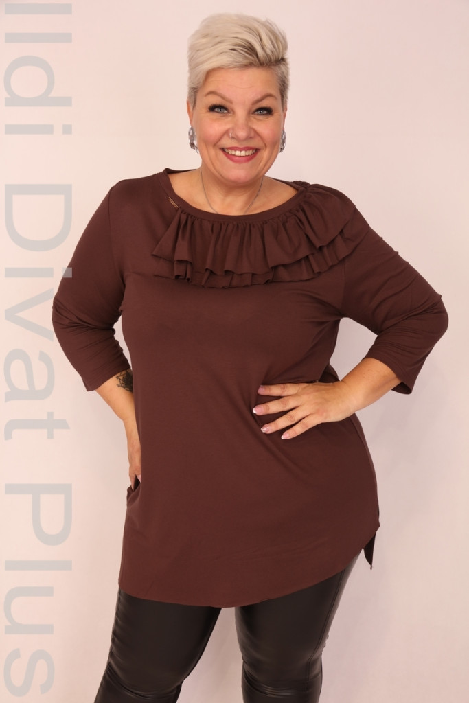 Caremo barna színű, kerek nyakú, nyakrészén fodros, alján aszimmetrikus enyhén lefele bővülő tunika.