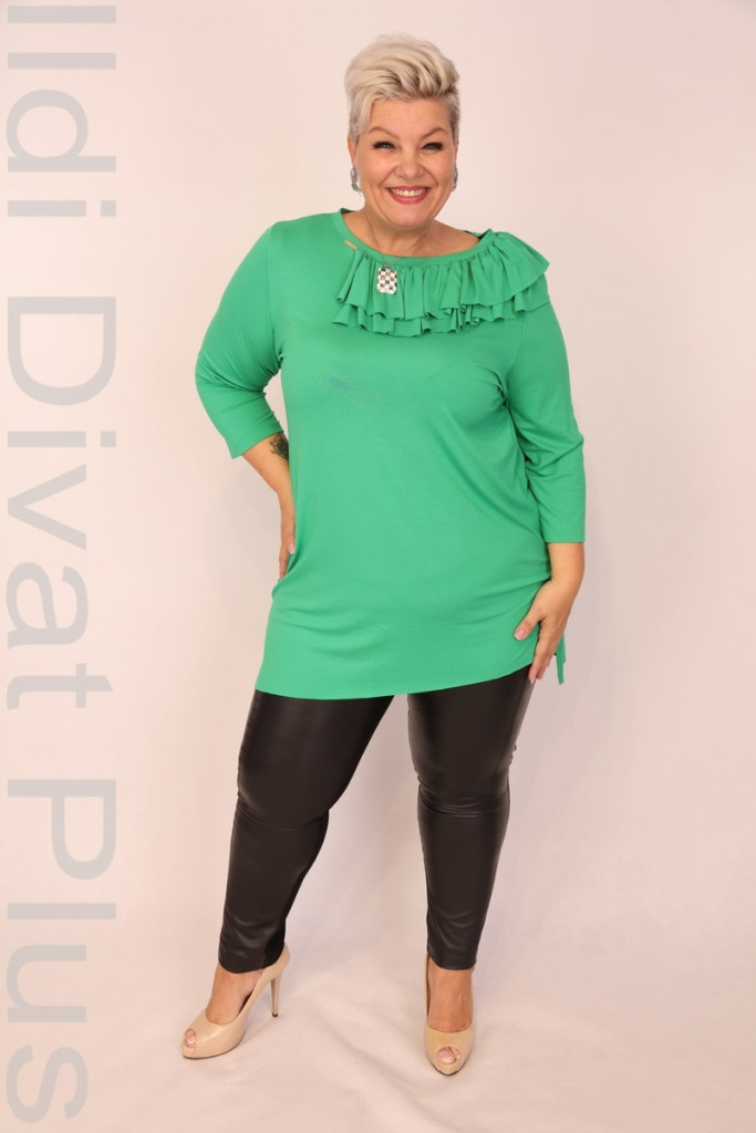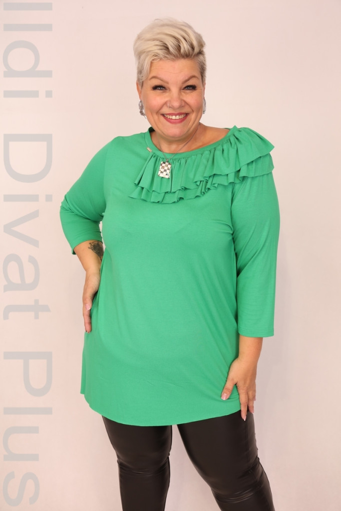 Caremo zöld színű, kerek nyakú, nyakrészén fodros, alján aszimmetrikus enyhén lefele bővülő tunika.