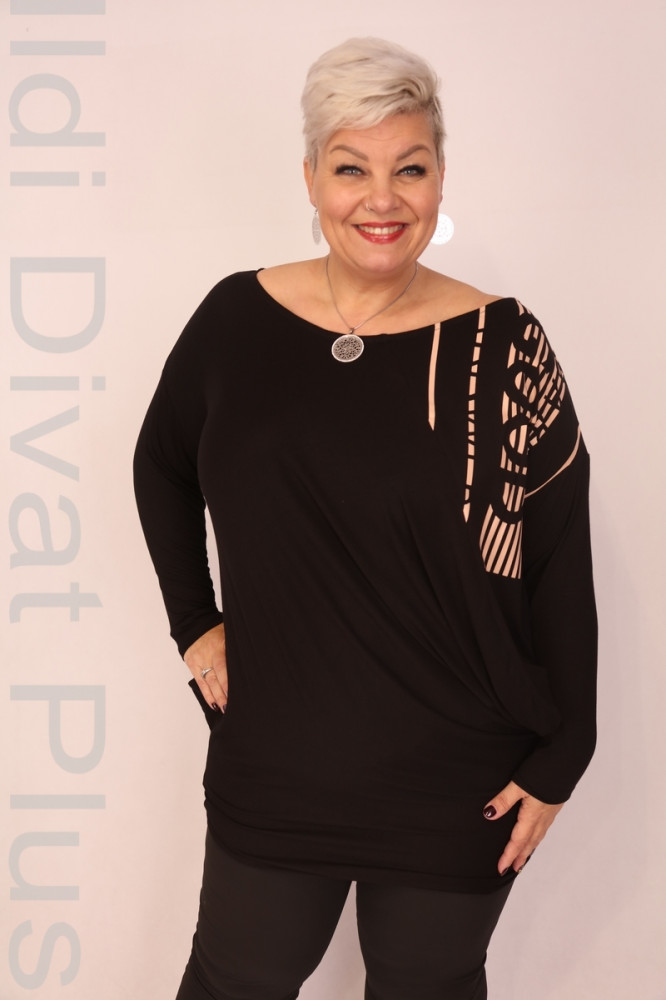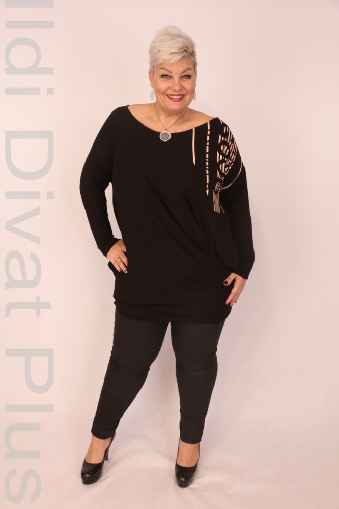 Caremo fekete színű, csónak nyakú, hosszú ujjú, filmnyomott, lezser fazonú tunika.