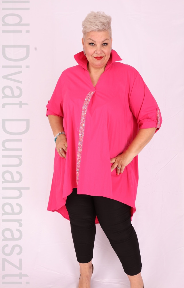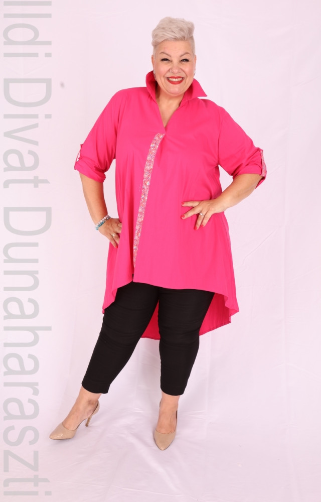 Pink galléros v nyakú nyomott mintás elején rövidebb hátul hosszabb ingtunika.