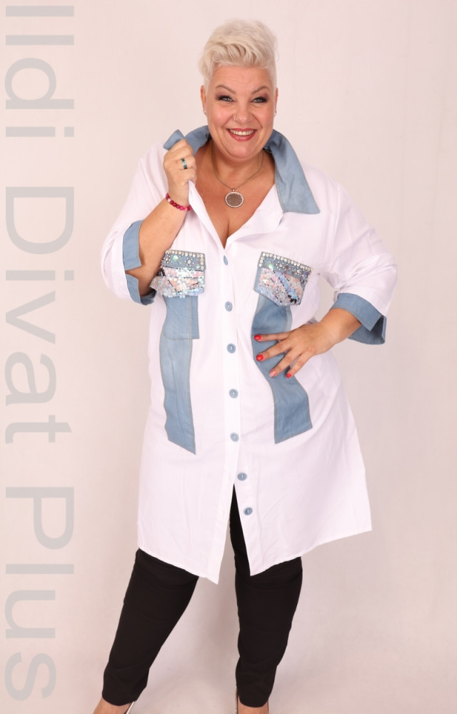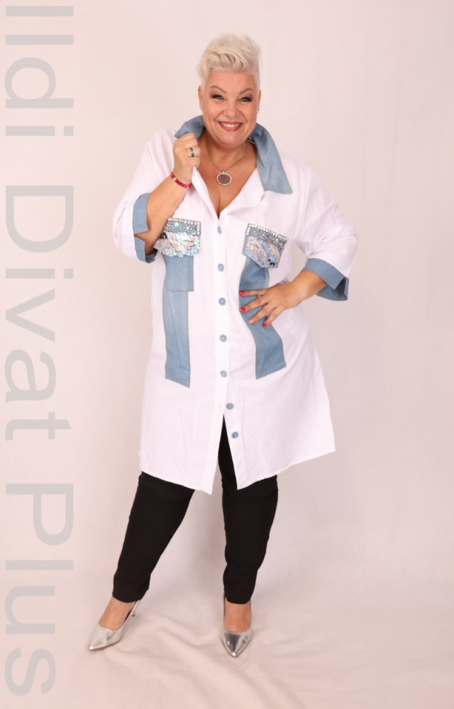 Fehér színű, köves, farmerbetétes ingtunika.