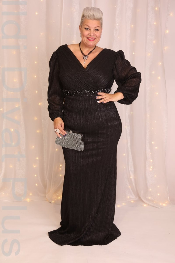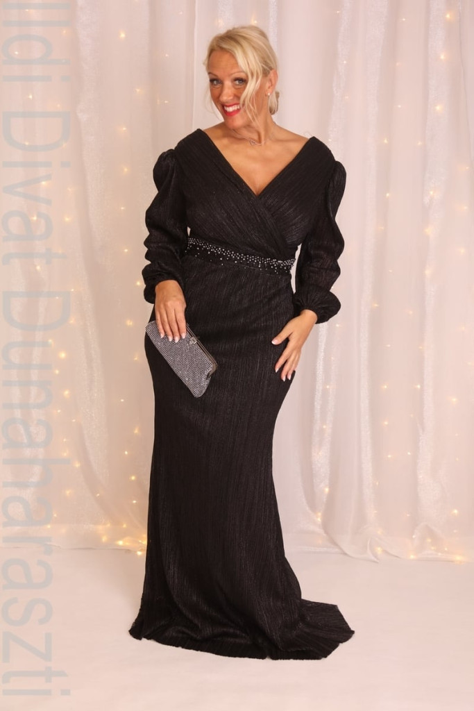 Favana fekete-ezüst derekán köves gyöngyös alkalmi maxi ruha.