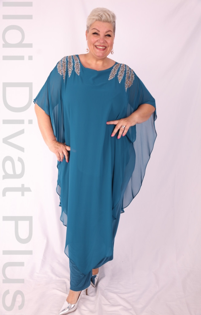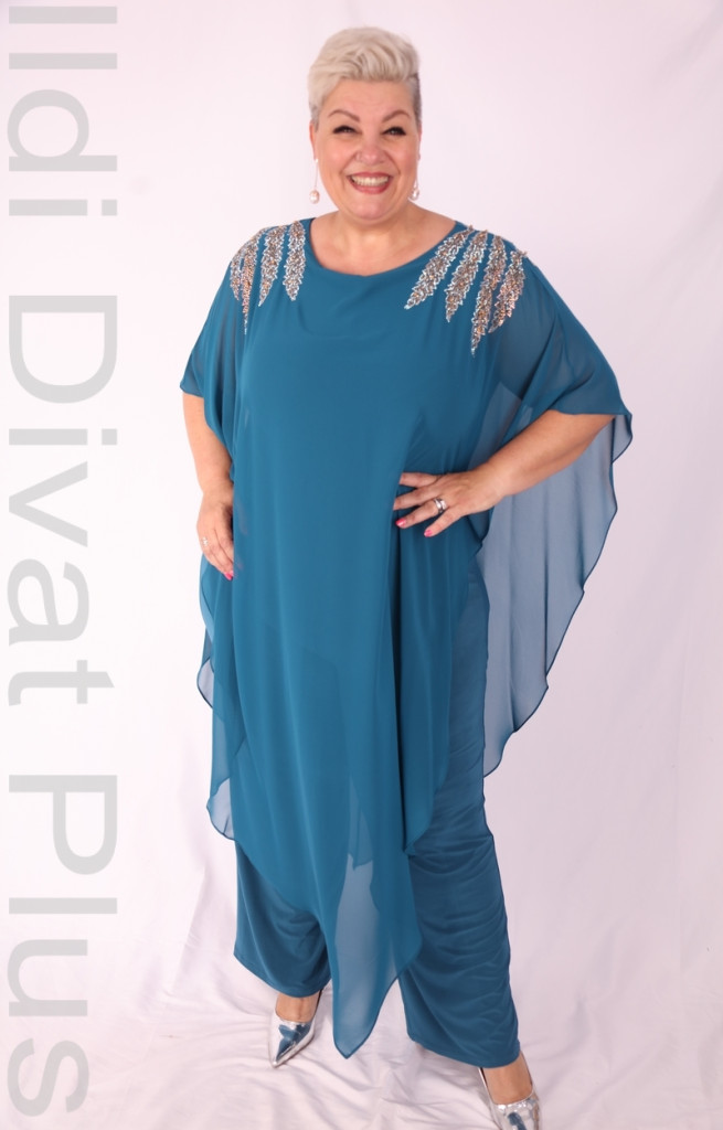 Hesba petrol vállán köves muszlin rátétes alkalmi overál.