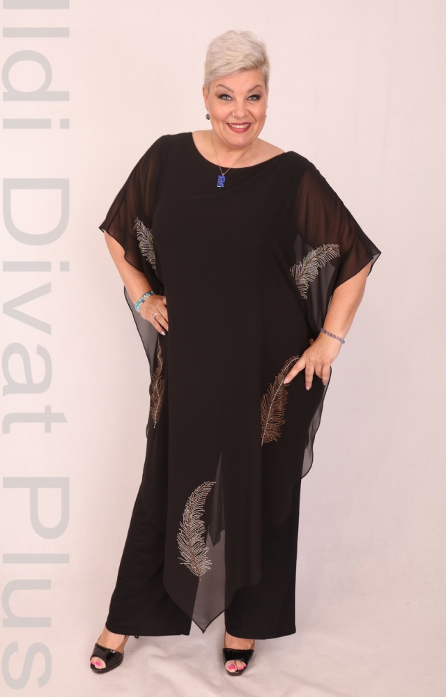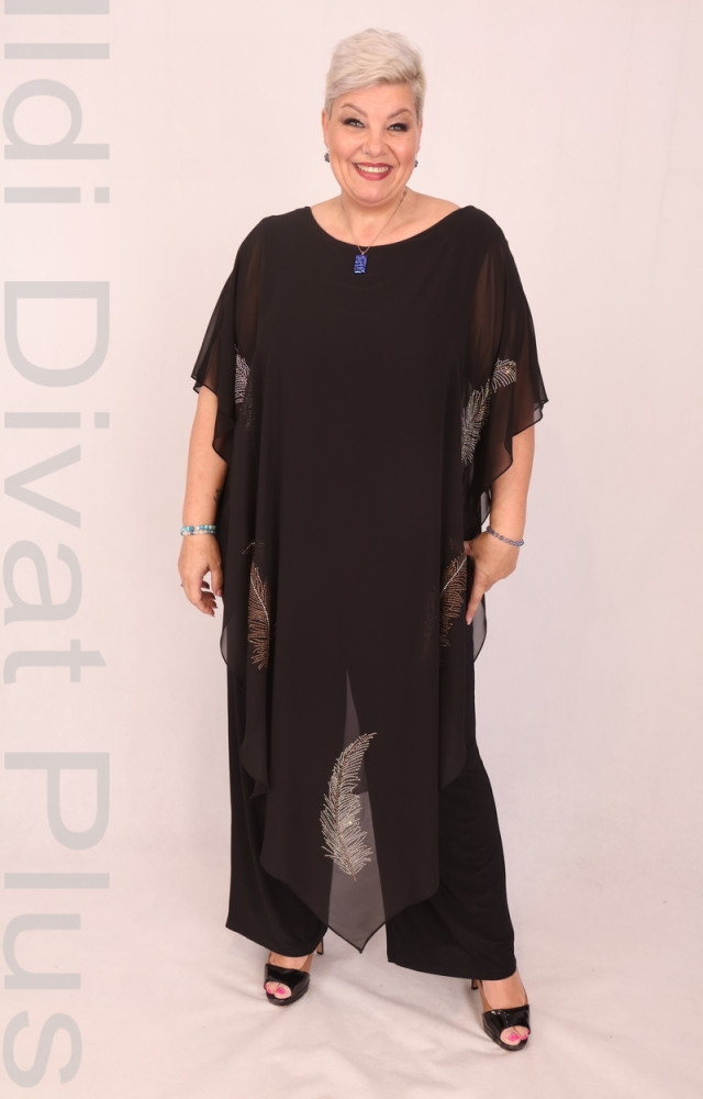 Fekete színű, toll mintás, köves, muszlin alkalmi overál.