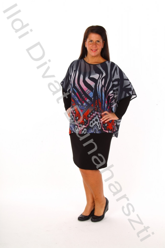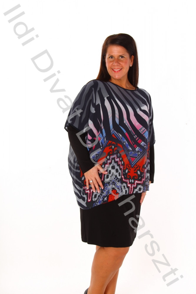 NJK fekete-szürke mintás, kerek nyakú, muszlin rátétes, karcsúsított fazonú ruha.