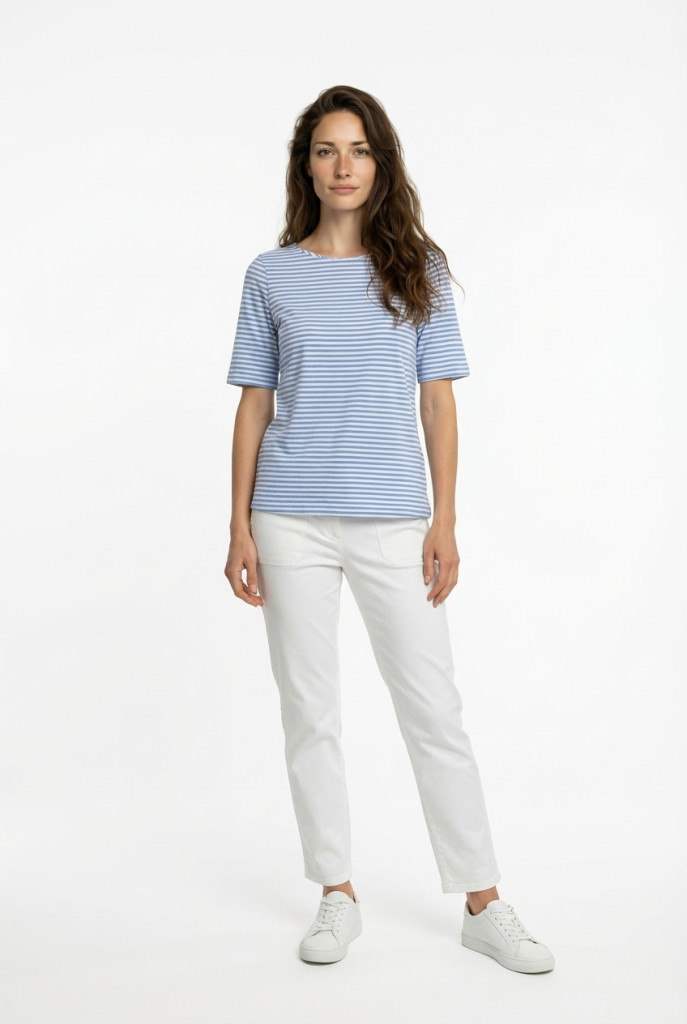 Eterna fehér alapon Kék csíkos rövid ujjú felső.