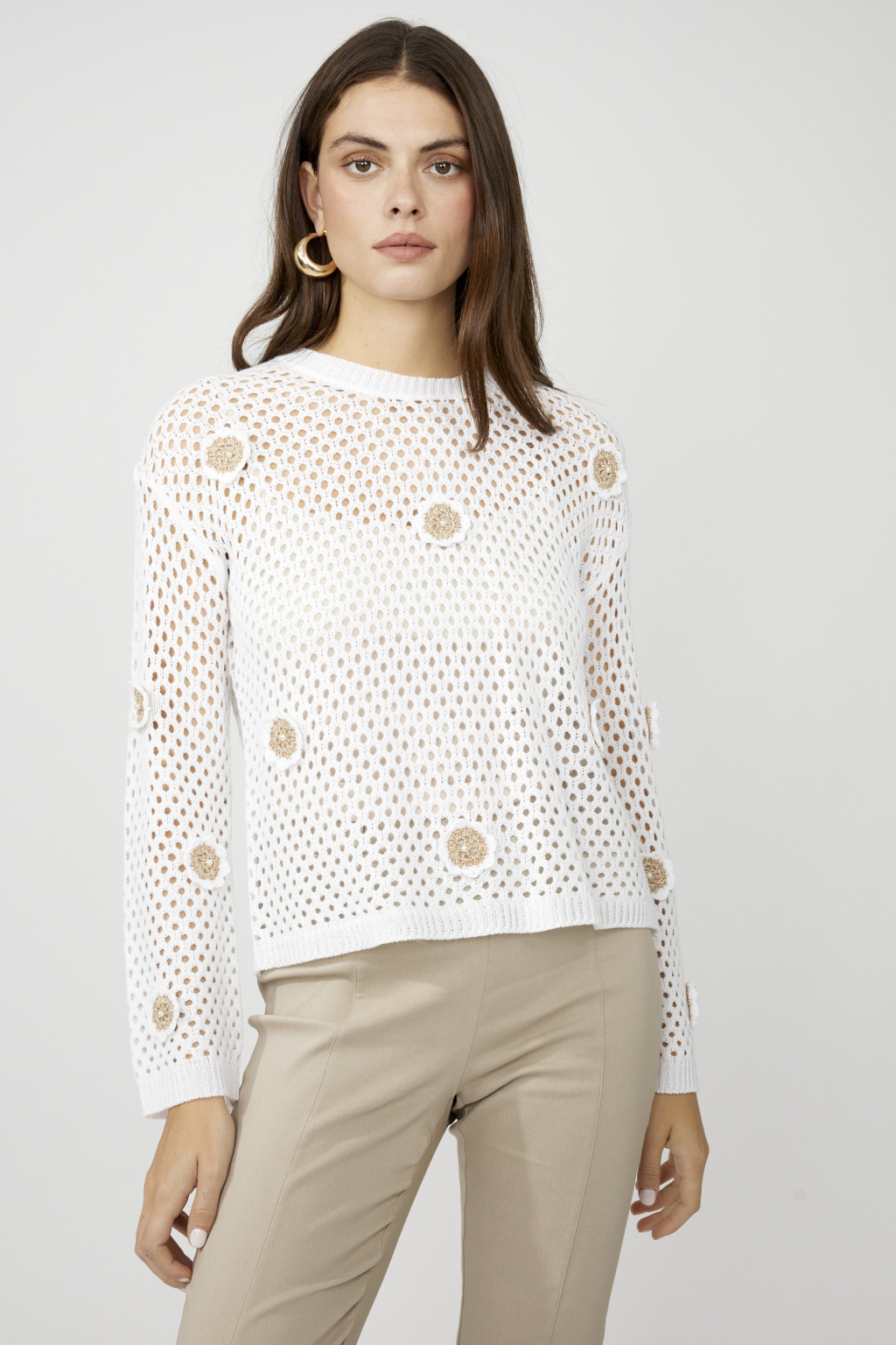 Frank Lyman ekrü színű, horgolt áttetsző anyagú, bronz színű virág és gyöngy díszítéses, egyenes fazonú felső.