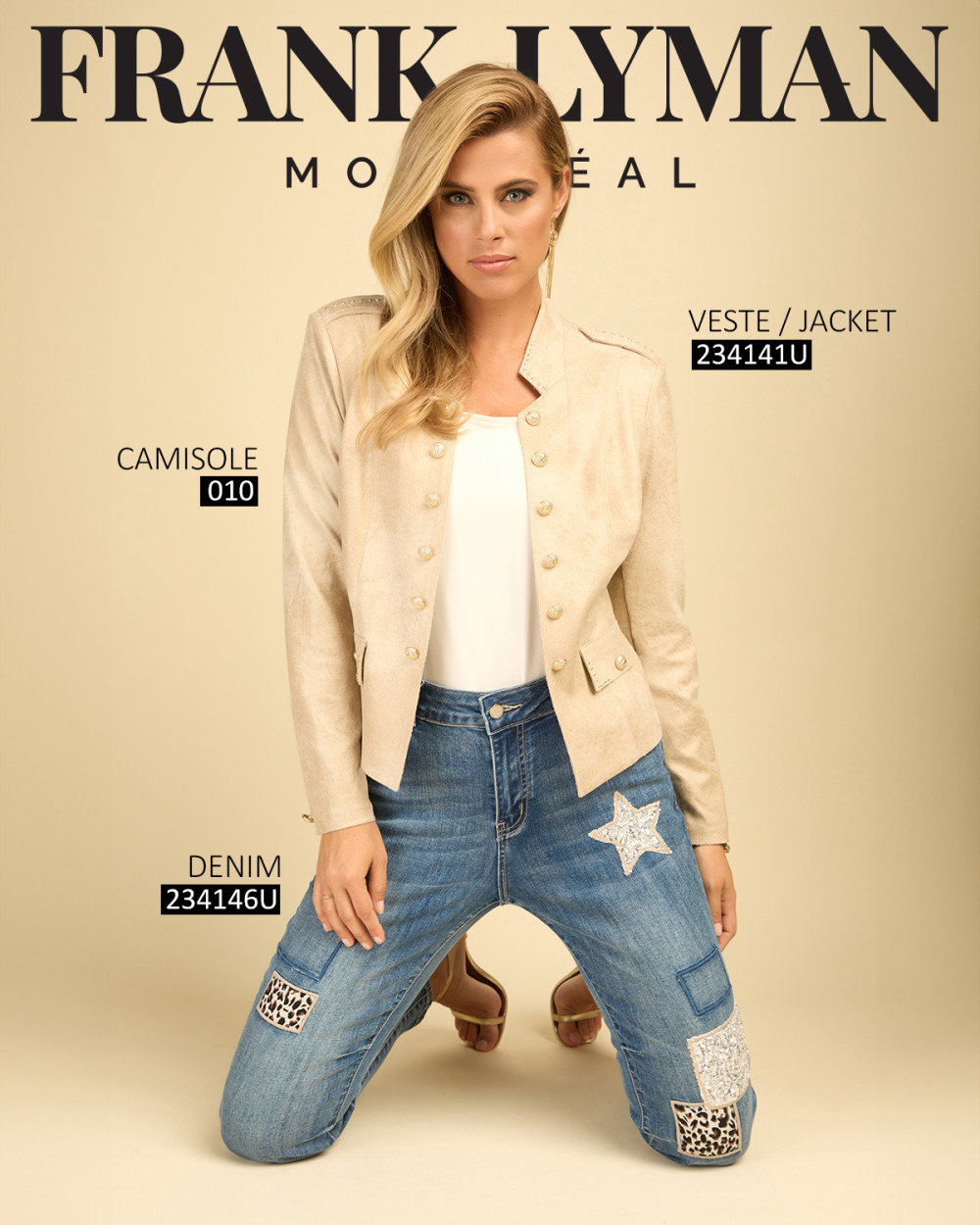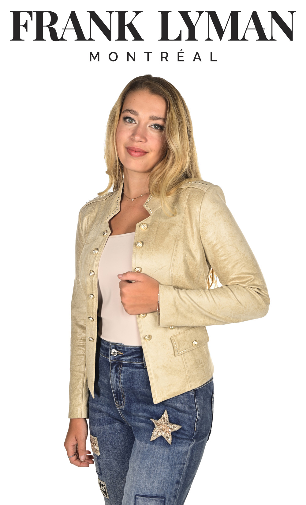 Frank Lyman pezsgő színű, márványos, álló galléros, elején arany díszgombos, díszzsebes, karcsúsított fazonú blézer.
