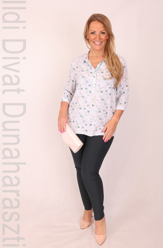 Fehér alapon zöld mintás, nyakán gombos blúz