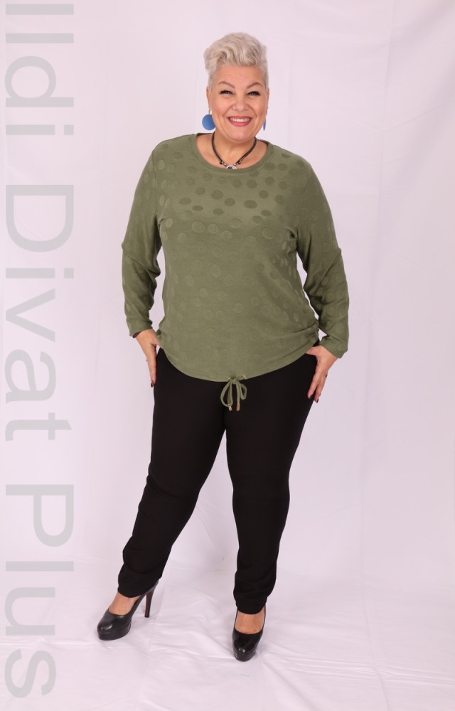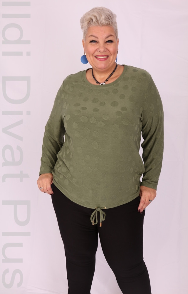 Khaki színű, anyagában pöttyös, kerek nyakú felső.