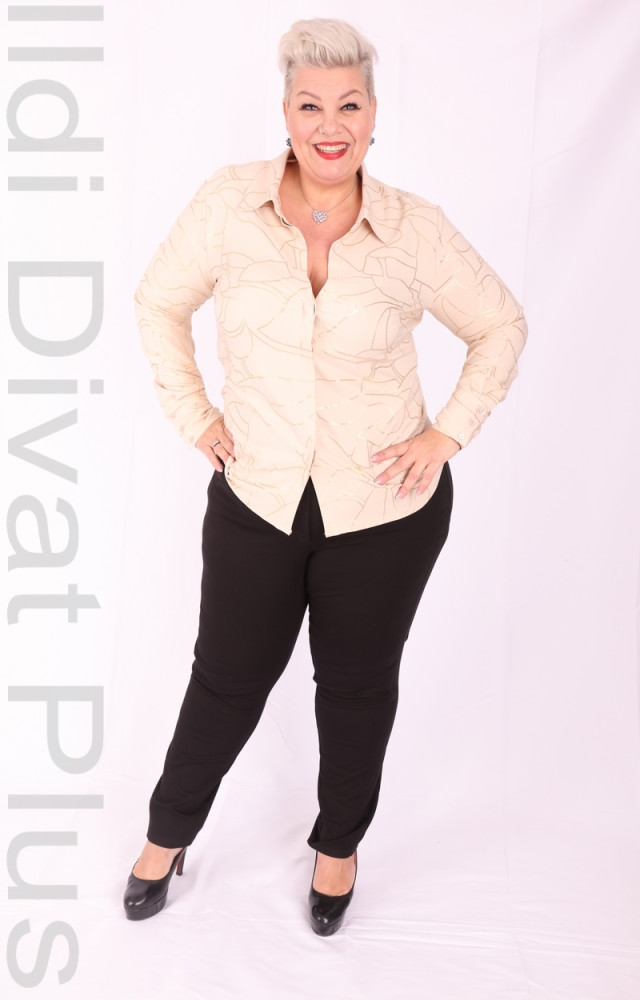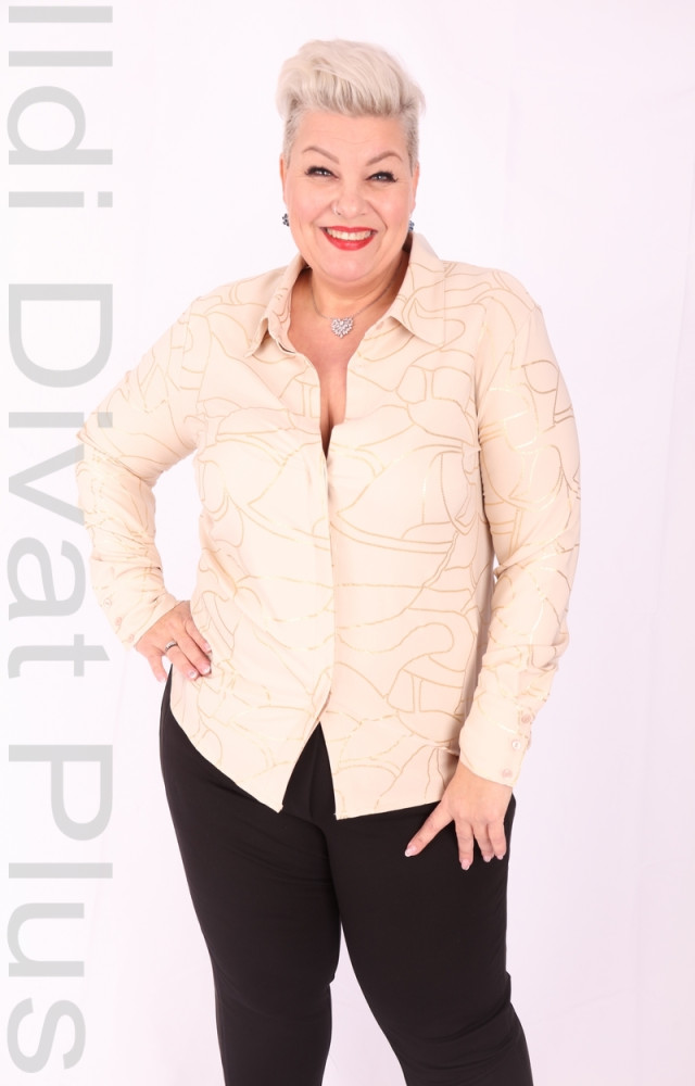 Beige-arany mintás, gombos, galléros blúz.