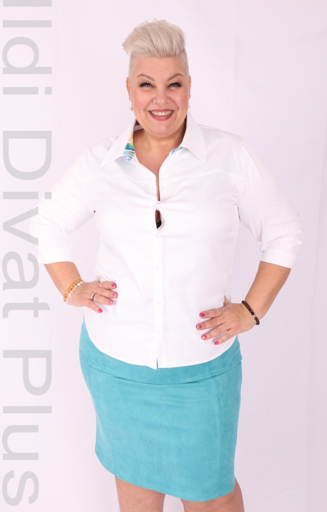 Fehér gombos galléros színes minta betétes blúz.