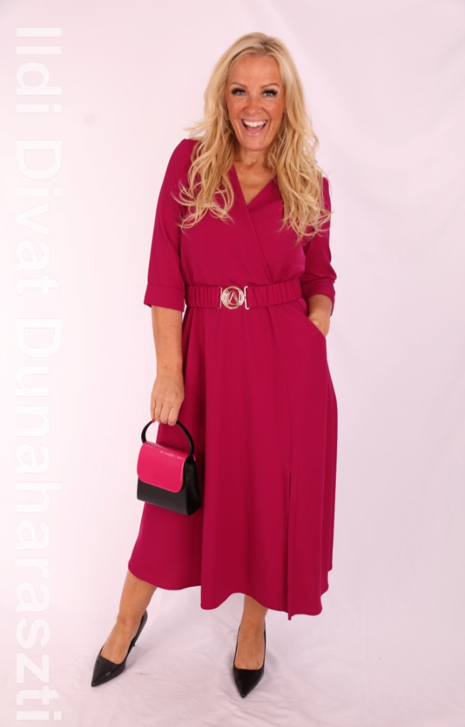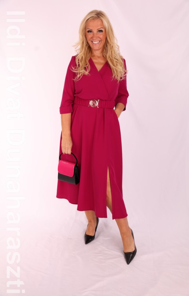 Mystic Day lila színű, mell részén átlapolt és V-kivágott, zsebes, derék részén gumírozott és öves, elején slicces, A-vonalú ruha.