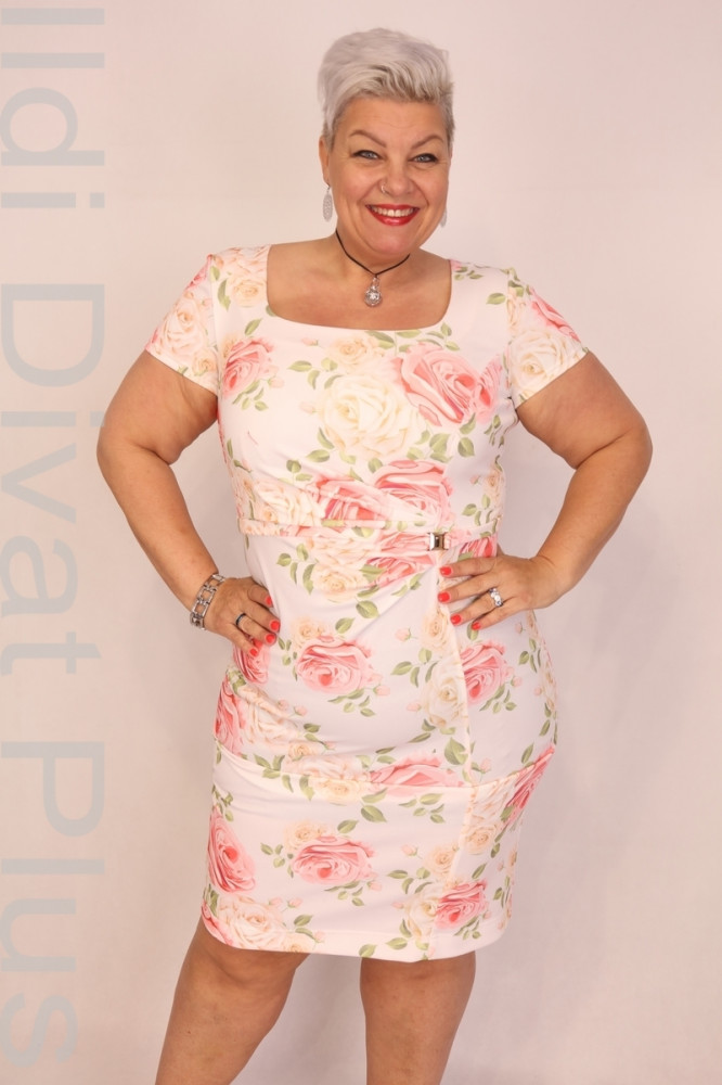 Mystic Day ekrü alapon virágmintás, derekán húzott és díszcsatos, karcsúsított fazonú ruha.