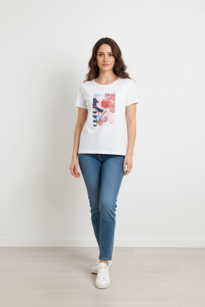 Olsen fehér alapon piros mintás köves rövid ujjú felső.