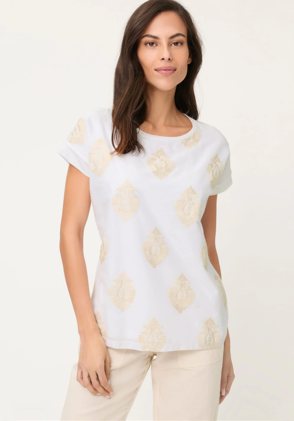 Ez a felső a modern dizájnt ötvözi a laza lezserséggel. A módosított kerek nyak letisztult és modern megjelenésű, míg a rövid kimonó ujjak laza, áramló sziluettet kölcsönöznek a ruhadarabnak. A kiegészítő szőtt elülső panel (67% pamut, 33% poliészter) bonyolult hímzéssel divatos megjelenést kölcsönöz, és igazi tekintetgyönyörködtetővé teszi a felsőt.