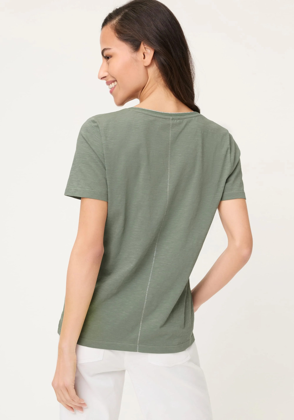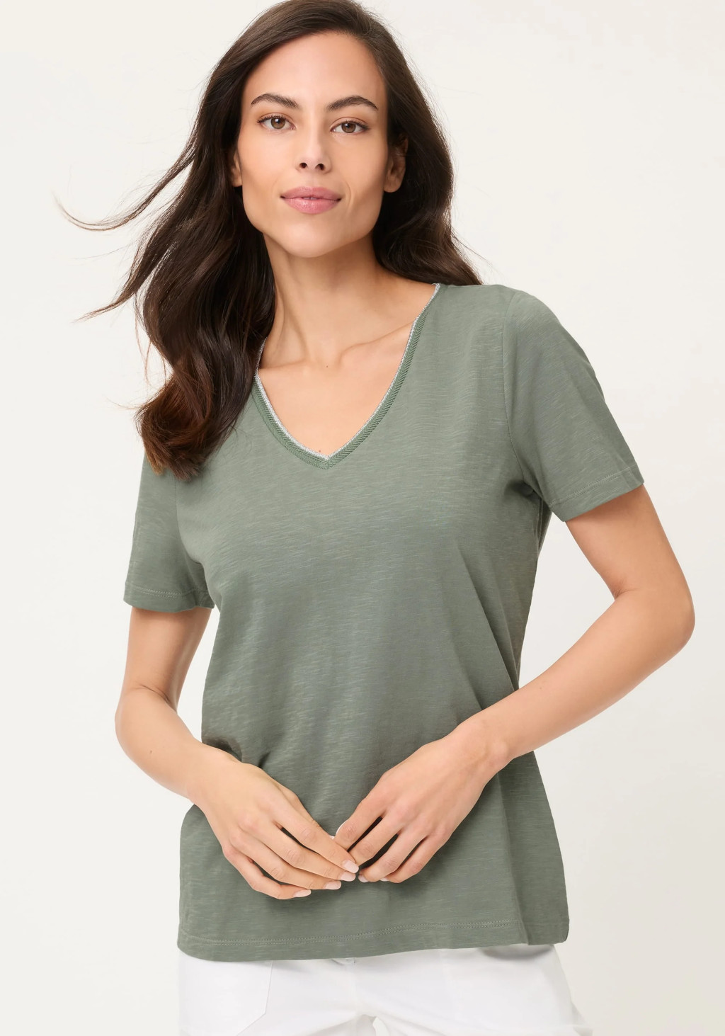 dőtlen darab a modern mindennapi megjelenéshez: Ez a póló klasszikus V-nyakkal és letisztult, minimalista dizájnnal tűnik ki. A félhosszú ujjak modern megjelenést kölcsönöznek, és sokoldalúvá teszik a stílust. Tiszta pamut slub jersey anyagból készült, kellemesen puha a bőrön, és ideális laza stílushoz mindennapi viseletre vagy irodába. Hossza kb. 60 cm.