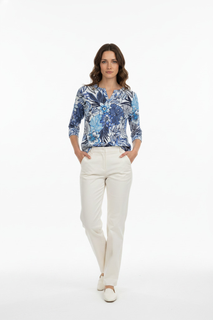 Fehér alapon kék mintás v nyakú alján passzés felső.