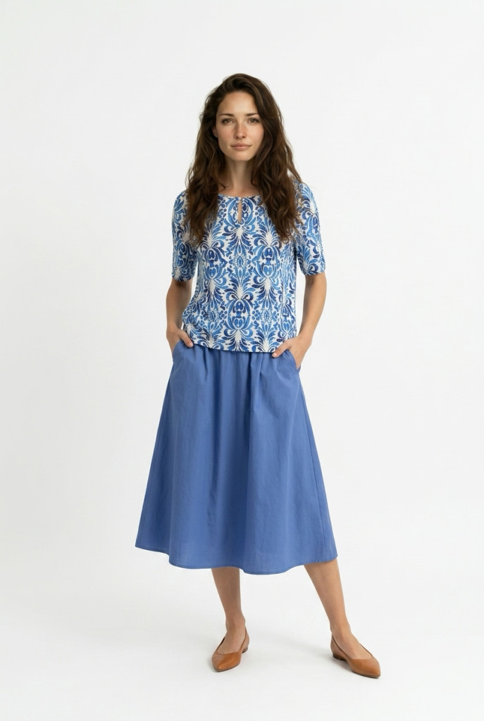 Olsen fehér alapon kék mintás nyakán gombos alján gumis rövid ujjú felső.