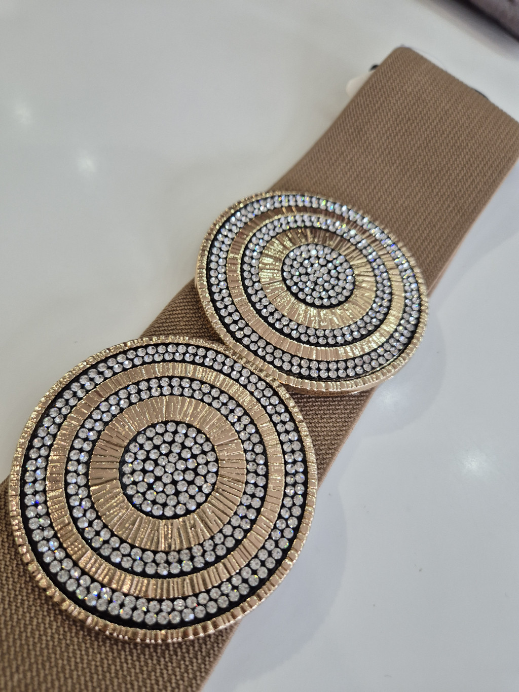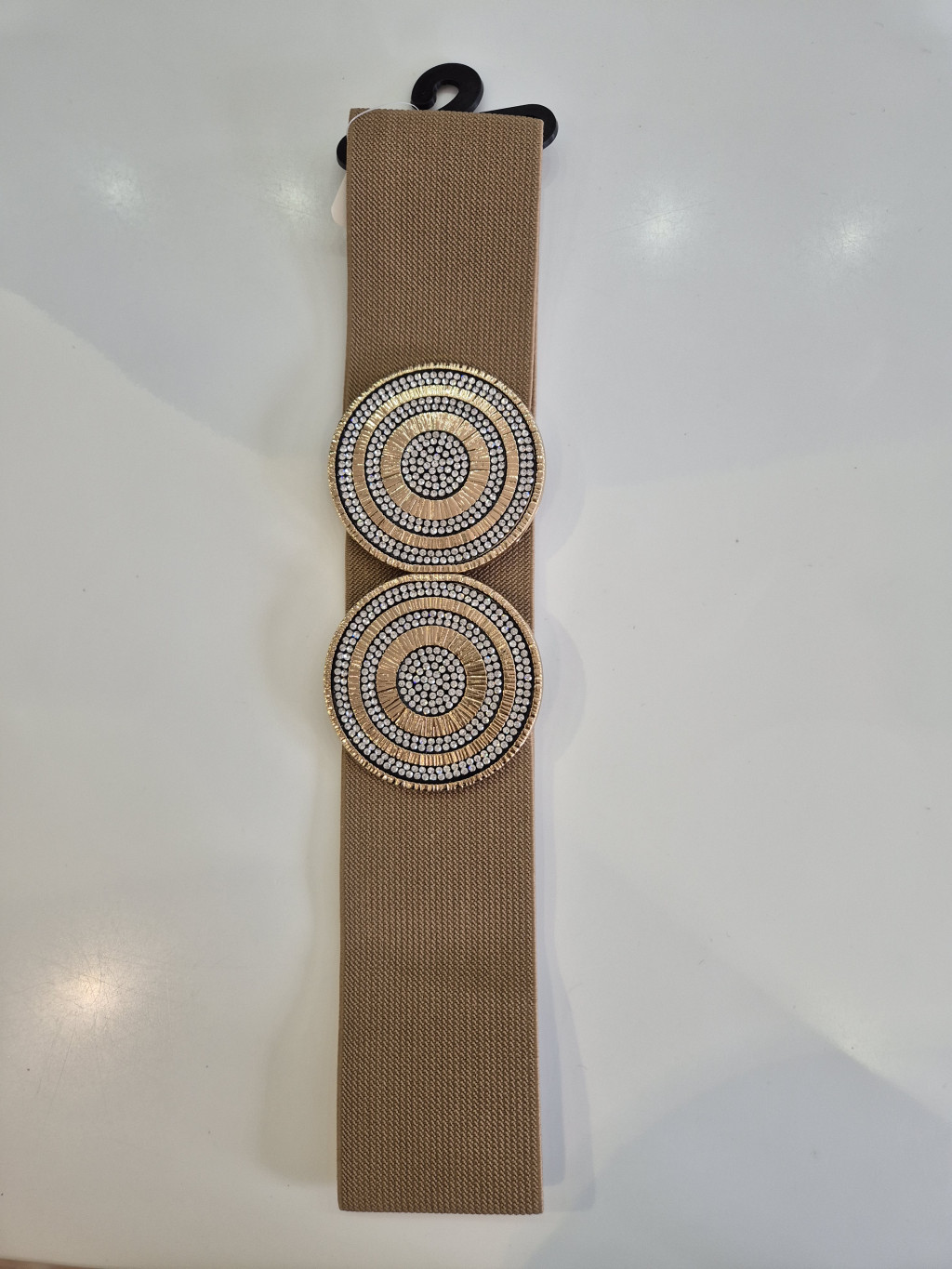 Tevebarna színű, elején strasszos és kapcsos, gumis öv.