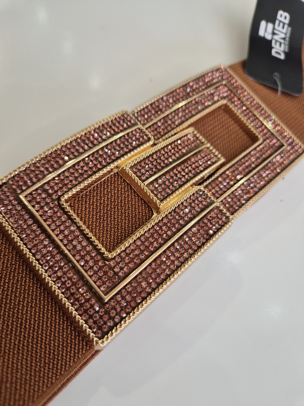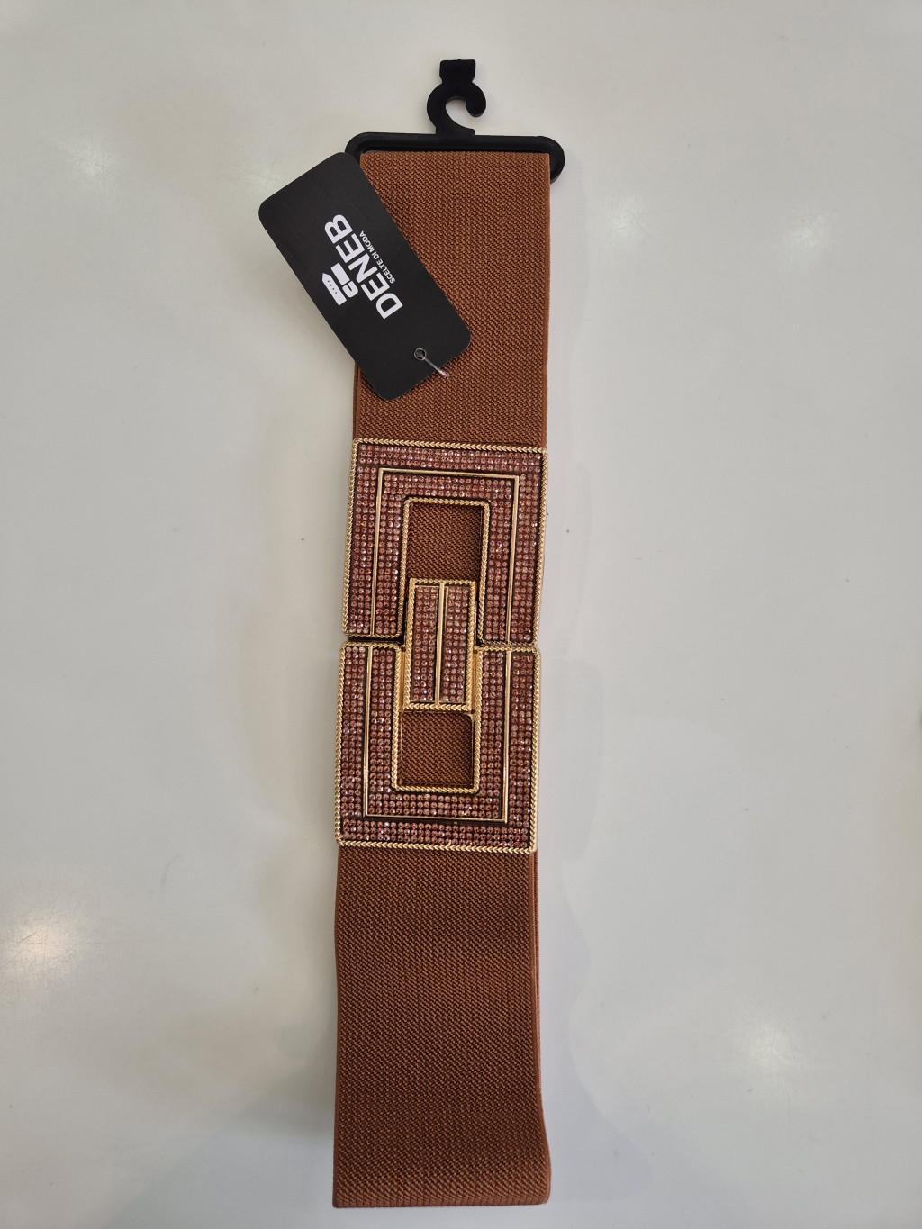 Barna színű, elején strasszos és kapcsos, gumis öv.