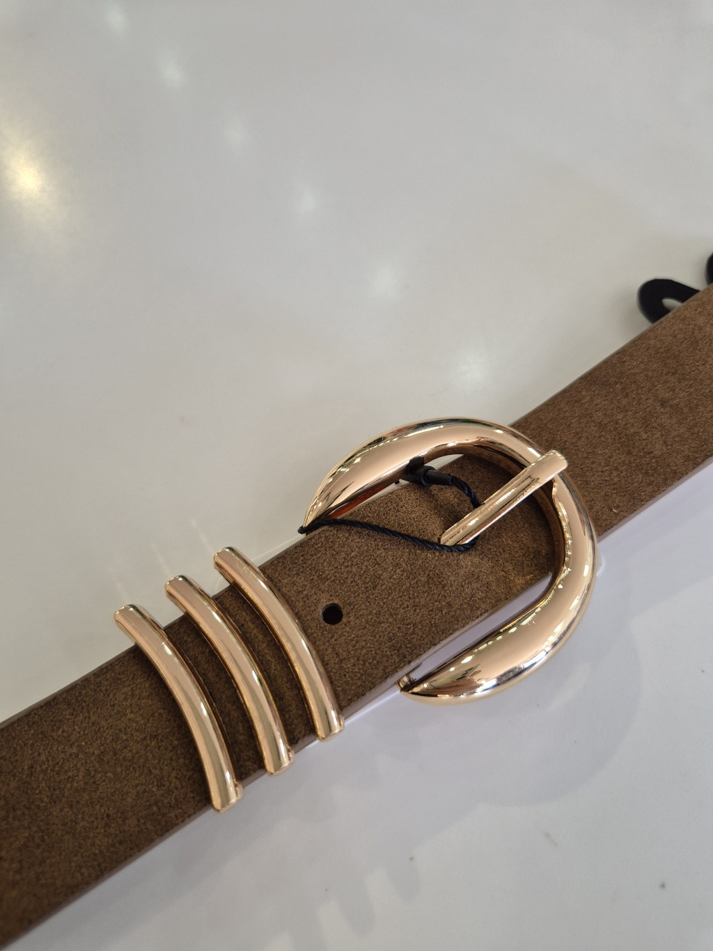 Tevebarna színű, elején arany csatos, gumis öv.