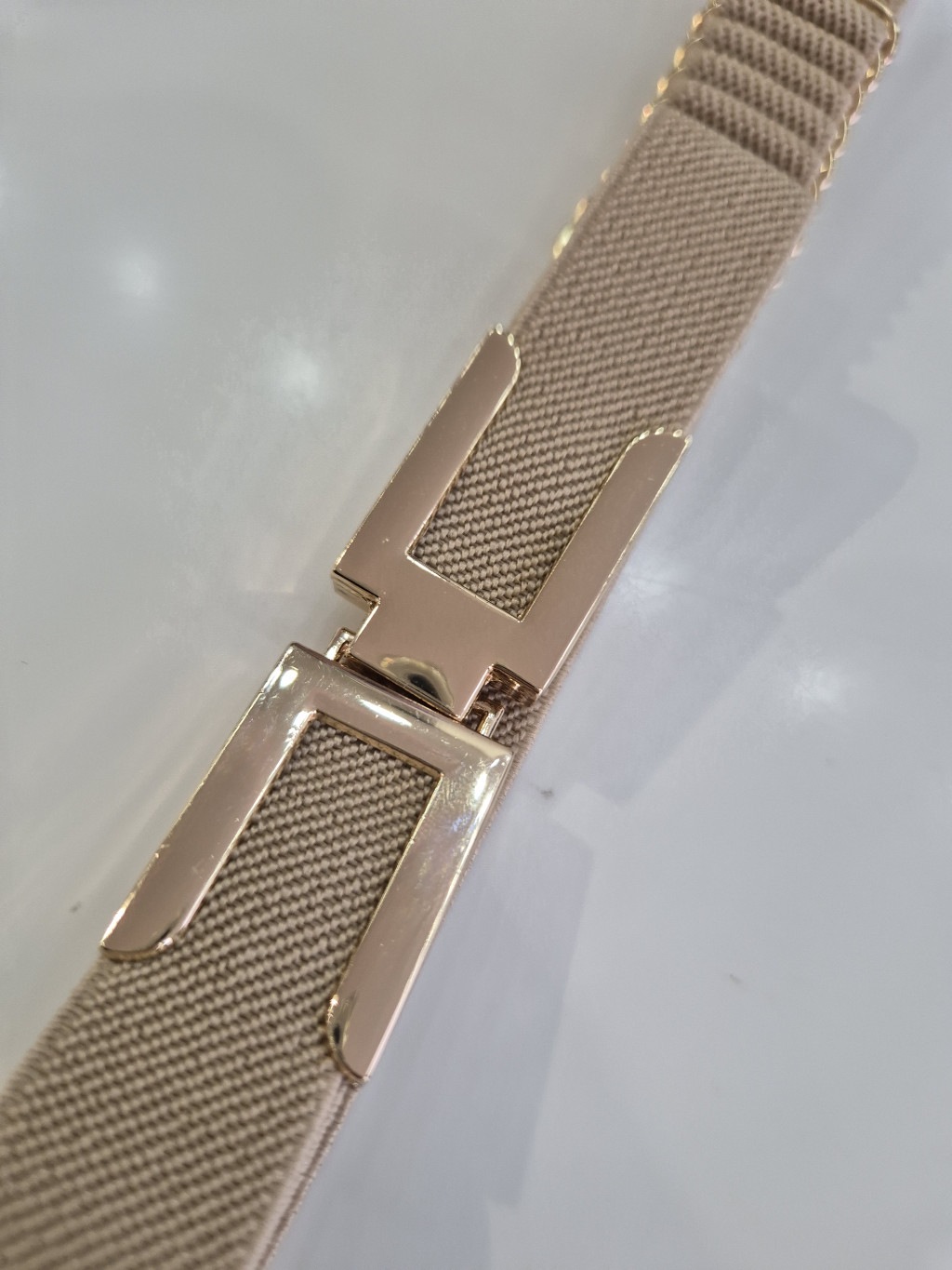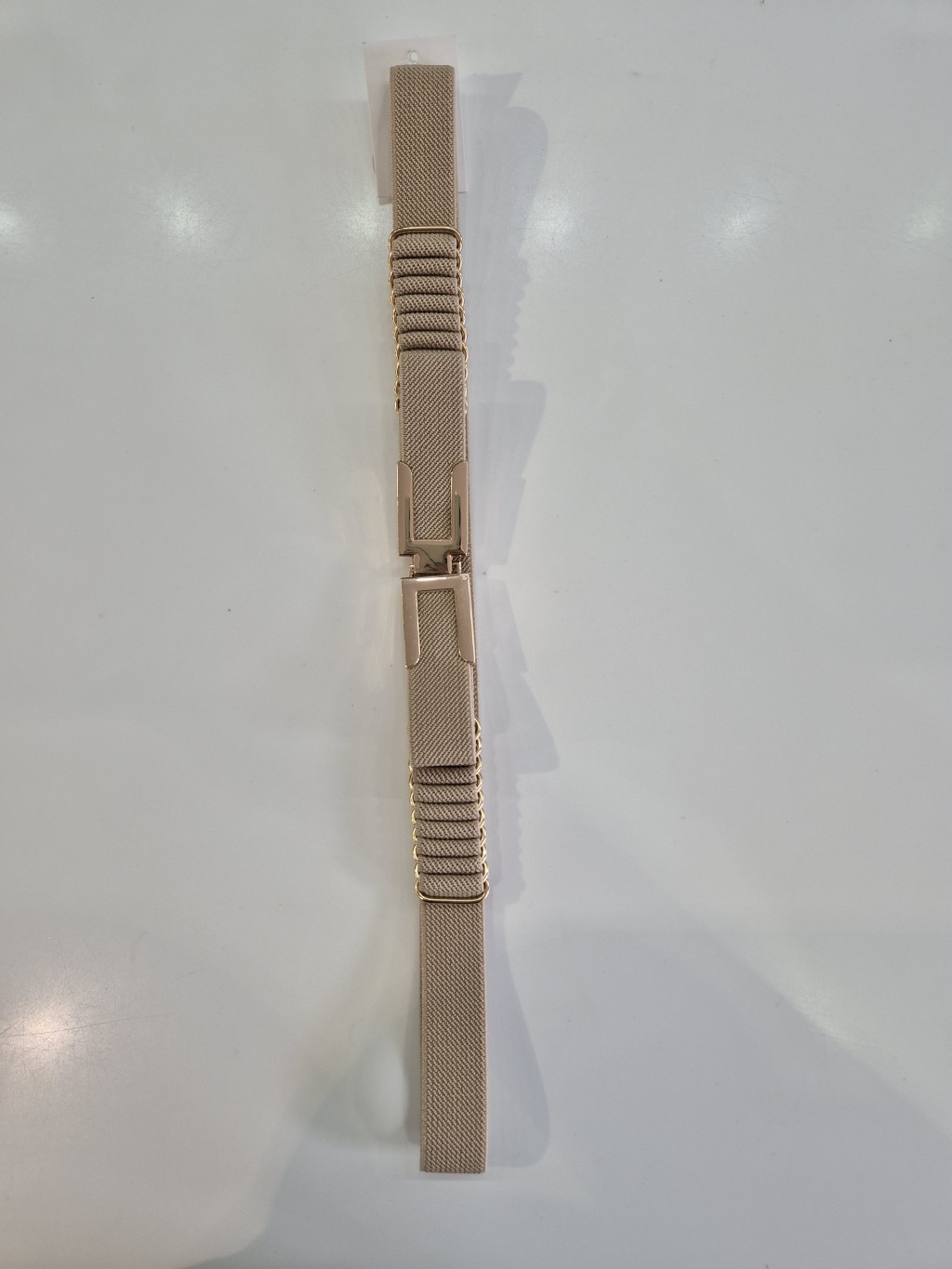Beige, elején kapcsos, vékony, gumis öv.