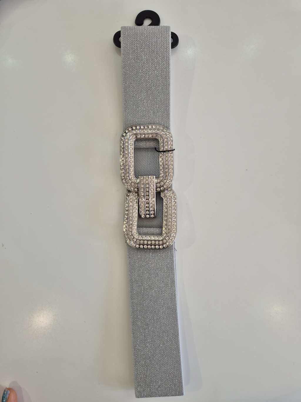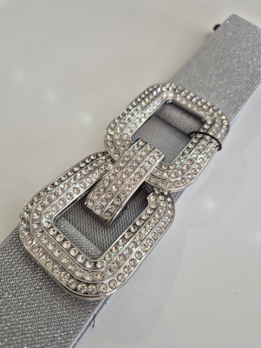 Ezüst színű, elején strasszos és kapcsos, vékony, gumis öv.