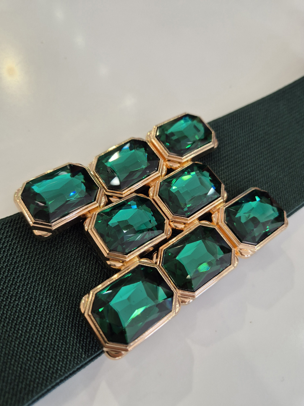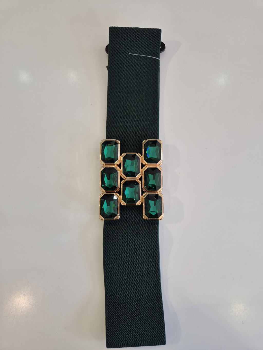 Zöld színű, elején kapcsos és strasszos, gumis öv.
