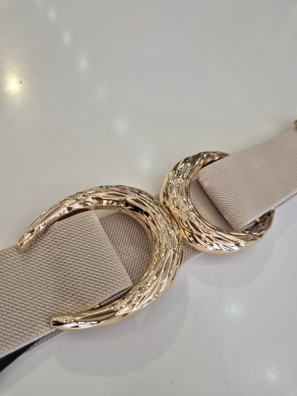 Homok színű, arany kapcsos, állítható, gumis öv.