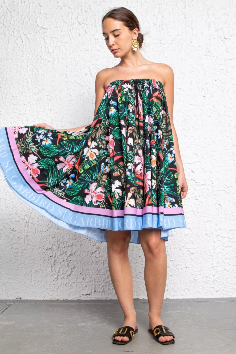 Fedezd fel, és vesd bele magad új, SUGARBIRD TOPICAL kollekciónkba. A fazon printelt mintáját fekete alapon trópusi virágok motívumai teszik a nyár egy különleges pillanatává.