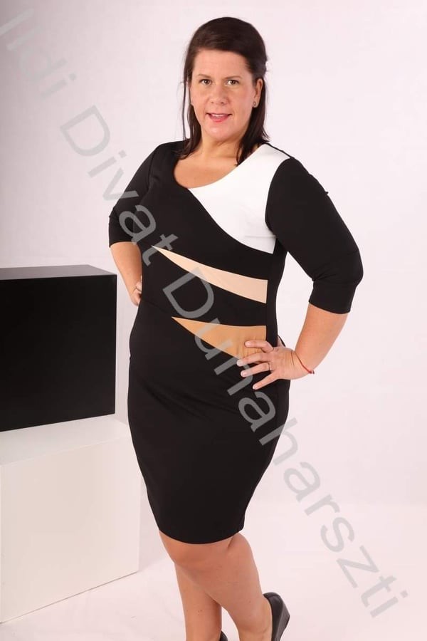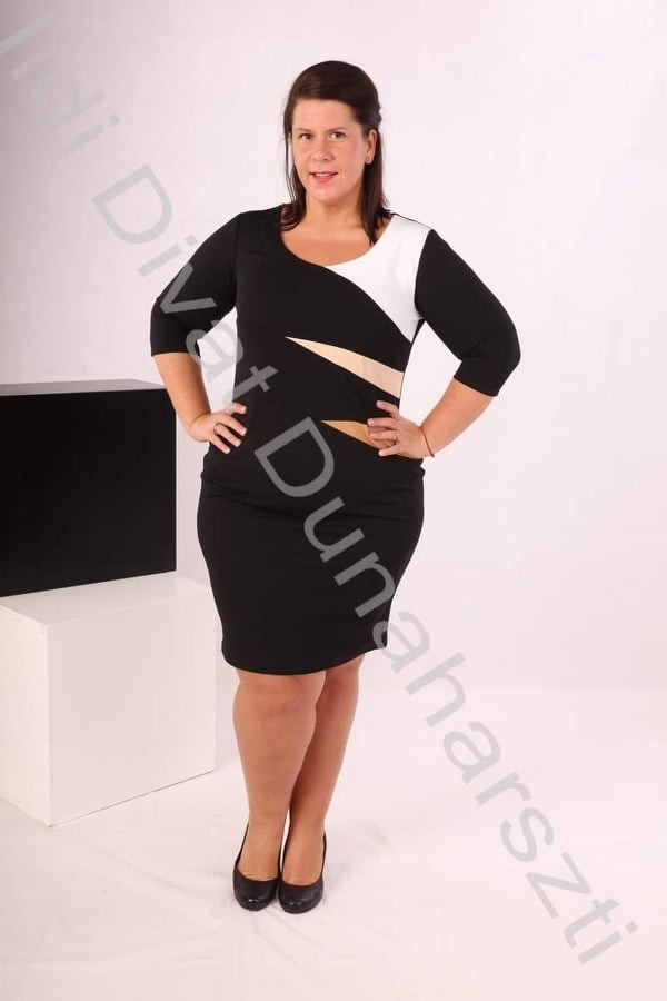 Simply fekete színű, kerek nyakú, fehér-beige-barna betétes, karcsúsított fazonú ruha.
