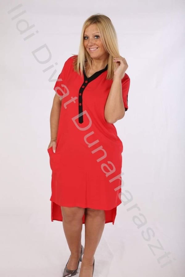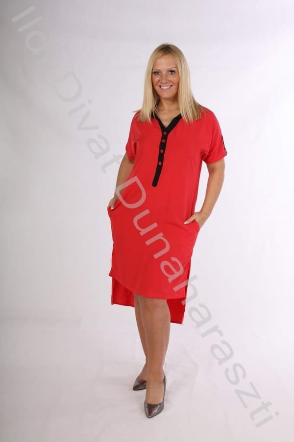 Victoria Maxi piros színű, V-kivágott, gombos, egyenes fazonú ruha.