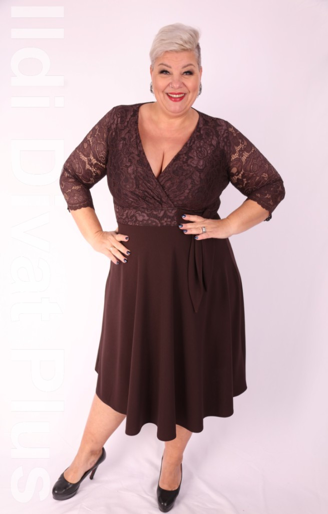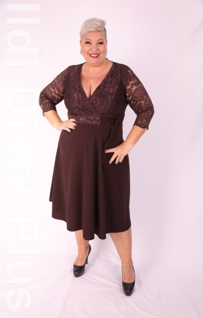 Zita barna 3/4 ujjú csipkés tetejű A vonalú ruha.
