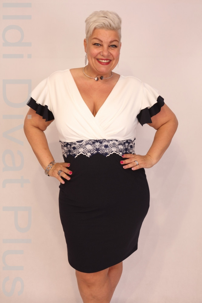 Zita fehér-kék színű, kerek nyakú, csipkés, derekán díszcsatos, karcsúsított fazonú ruha.