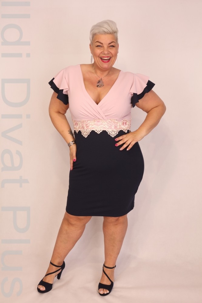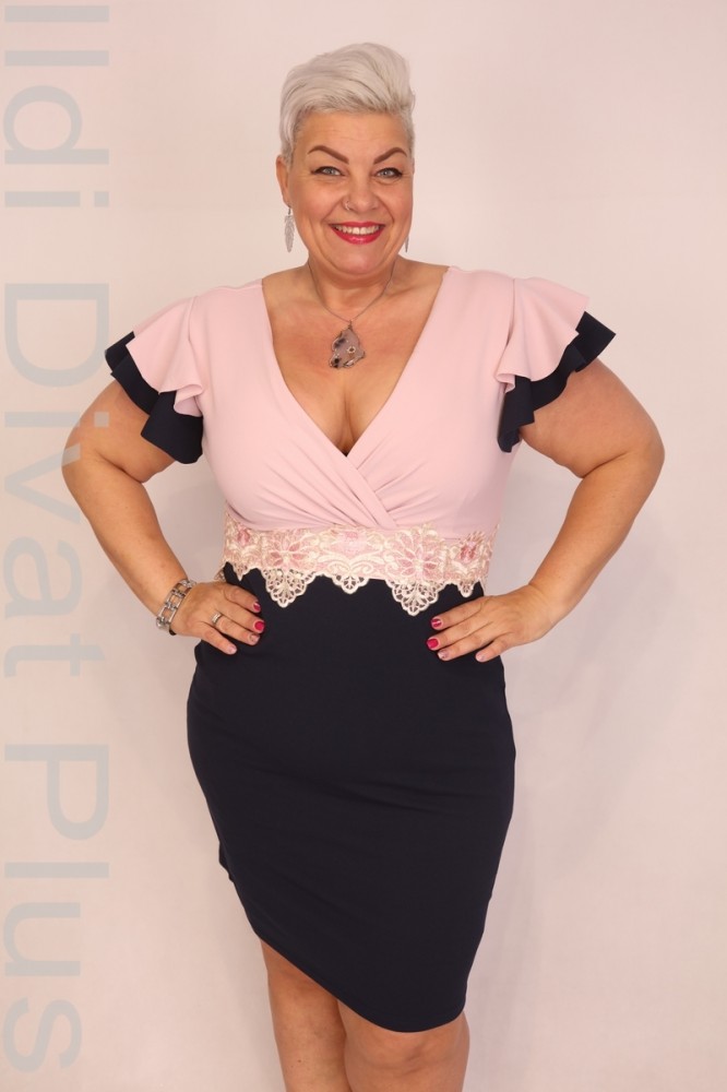 Zita púder-sötétkék színű, V-kivágott, mell részén átlapolt és húzott, csipkés, ujja végén fodros, karcsúsított fazonú ruha.