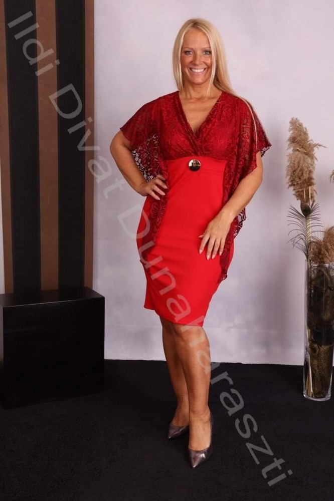 Zita piros színű, V-kivágott, csipke rátétes, derekán díszcsatos, karcsúsított fazonú ruha.