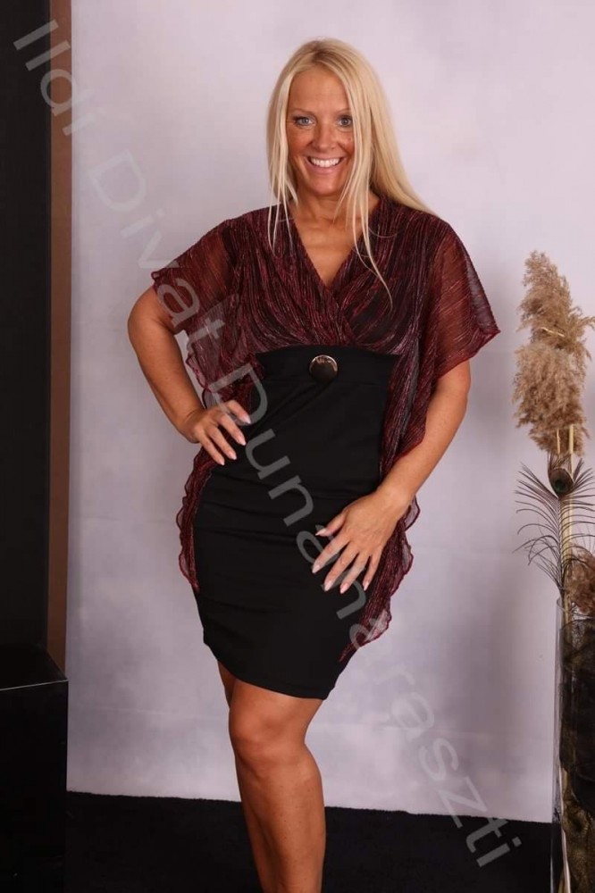Zita bordó-fekete színű, V-kivágott, átlapolt, felső részén rátétes, derék részén díszcsatos, alsó részén karcsúsított fazonú ruha.