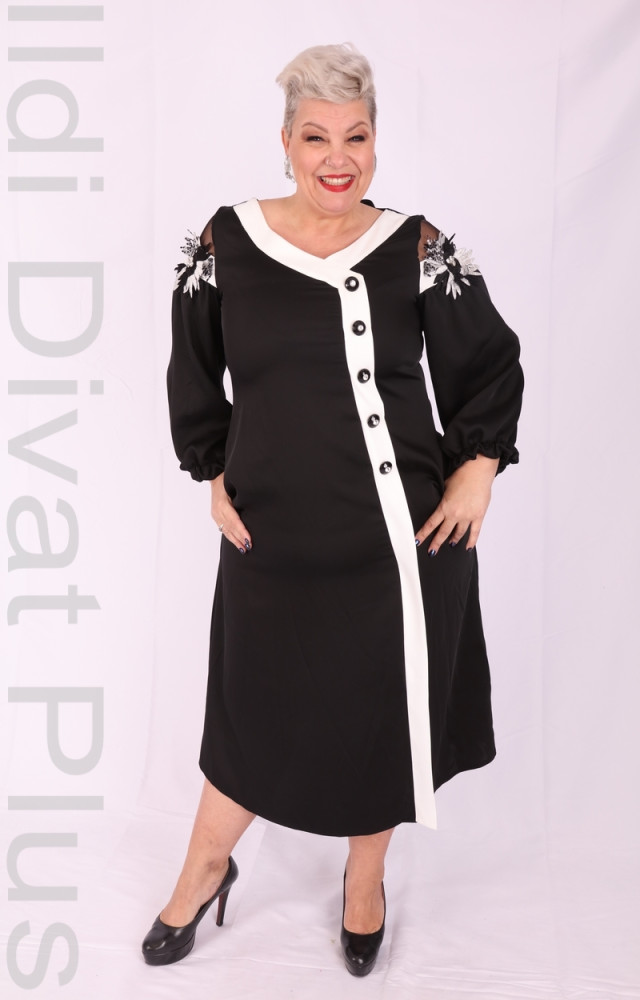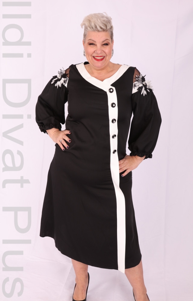 Darkwin fekete-fehér színű, V-kivágott, gombos, vállán virág díszítéses, egyenes fazonú ruha.