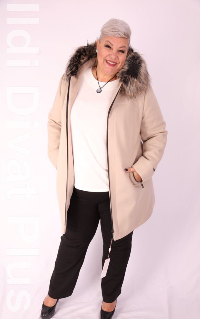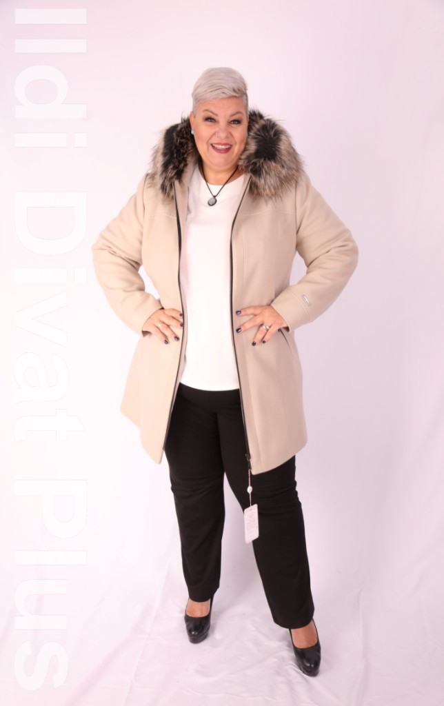 Barna színű, fix kapucnis, levehető szőrmés, cipzáras szövet kabát.