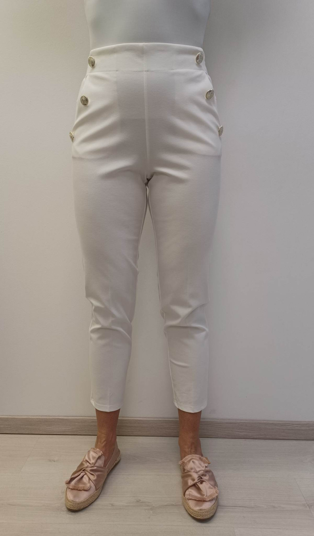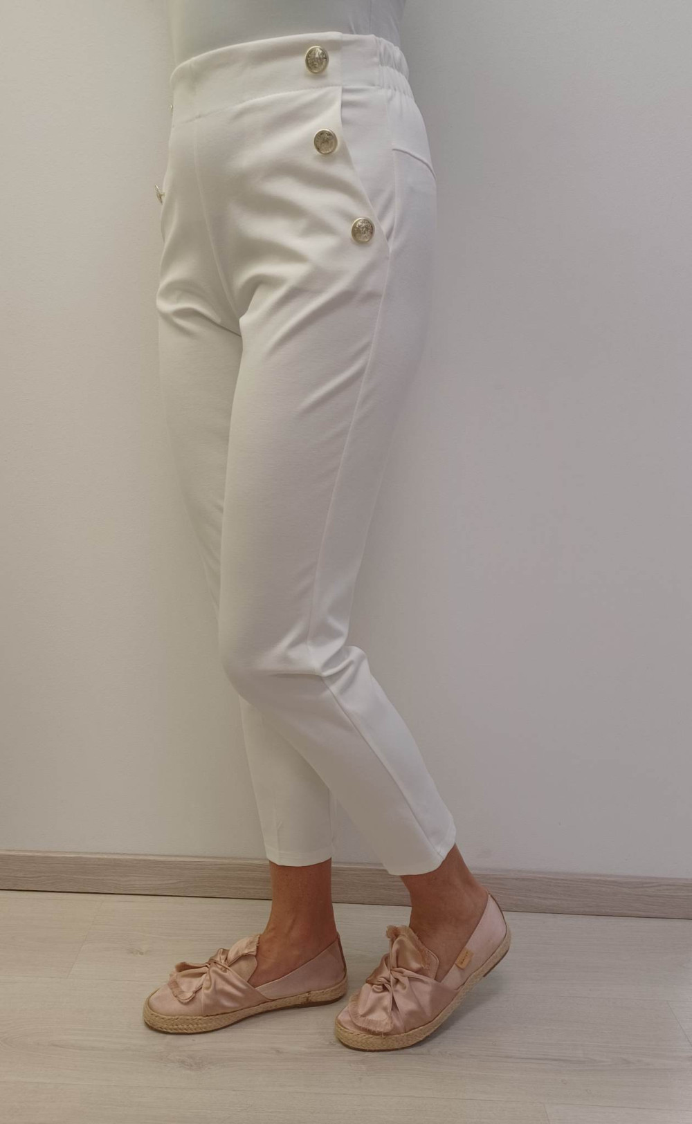 Fehér színű, arany gombos, hátul derék részen gumis nadrág.