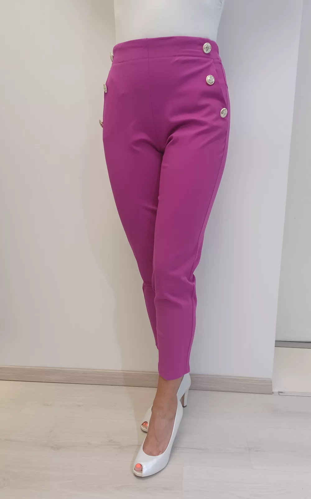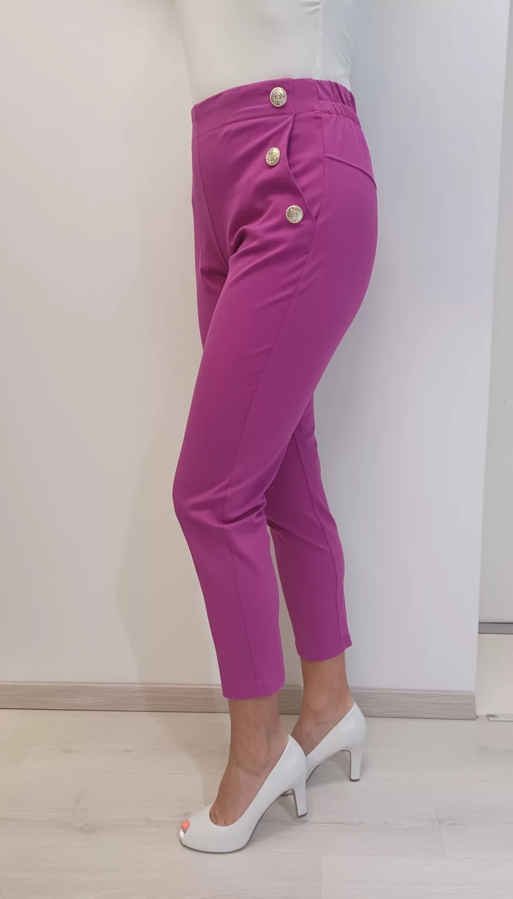 Lila színű, arany gombos, hátul derék részen gumis nadrág.